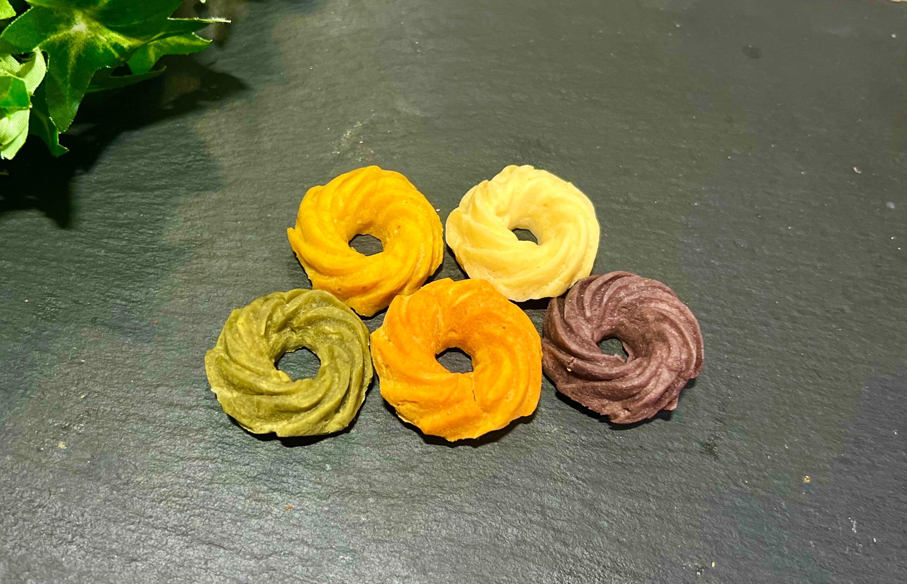 紫芋・カボチャ・大麦若葉、にんじん味で素材の甘みが際立ち、ヘルシーなドーナツラスクです!